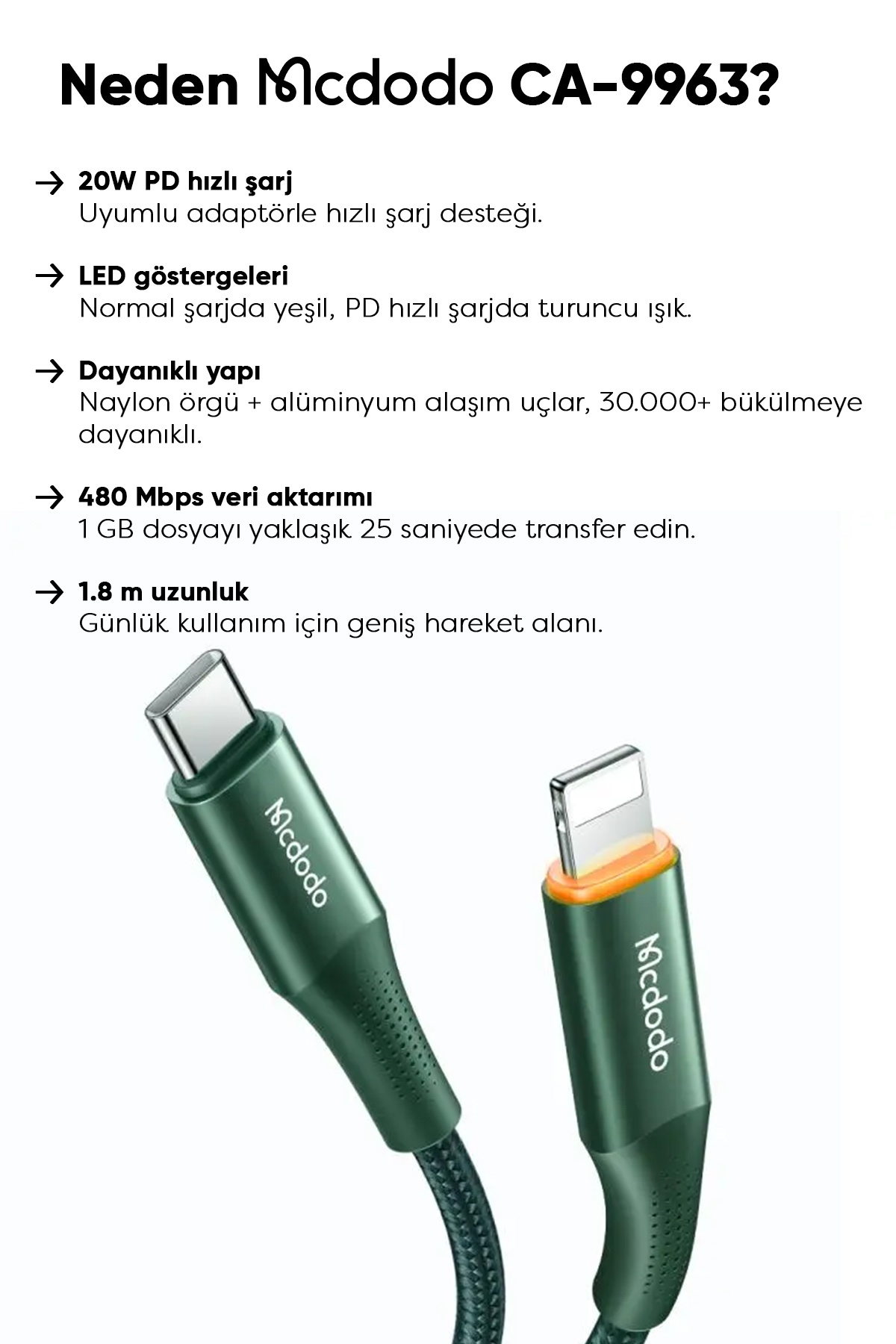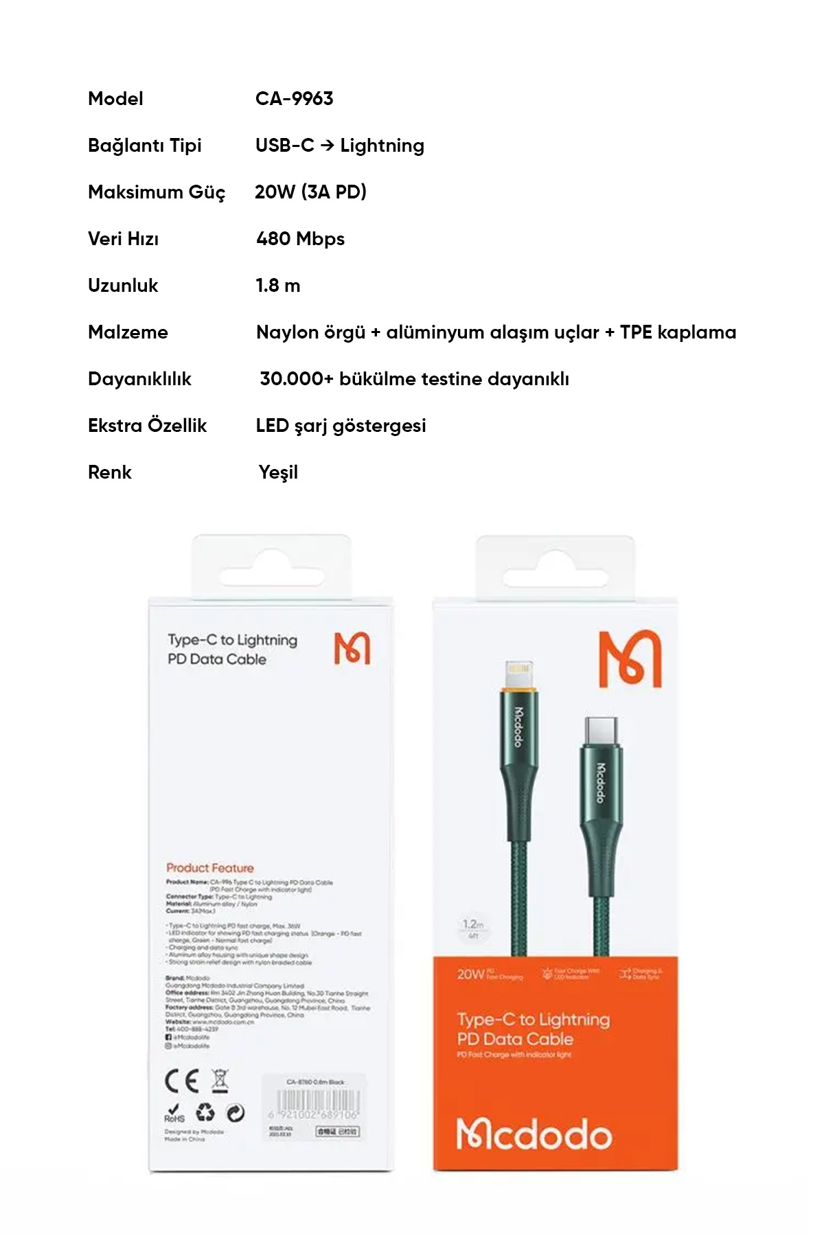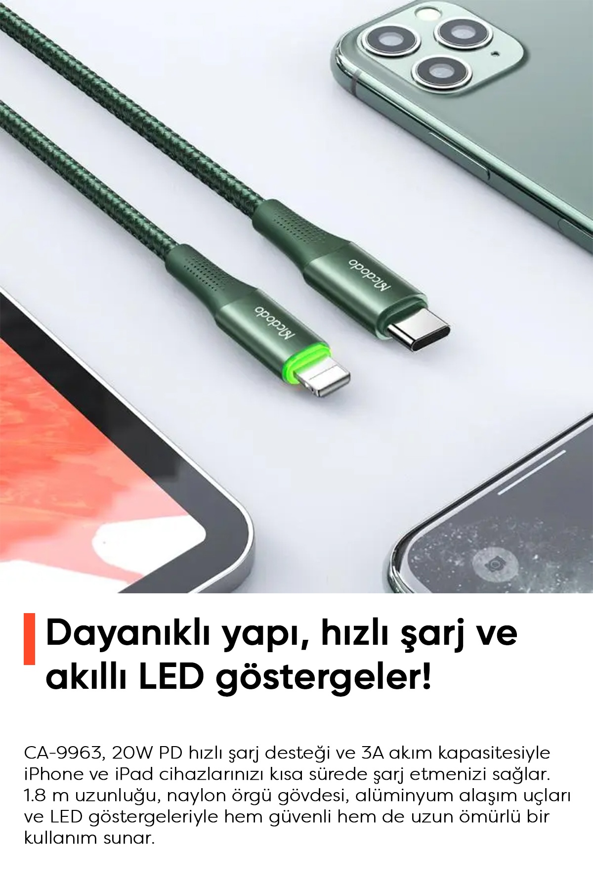 Mcdodo CA-9963, 20 watt çıkış gücü ve 3 amper akımı ile hızlı PD şarj teknolojisine sahip, 1.8 metre uzunluğundaki yeşil kablolarla tanışın. Bu kablo, akıllı cihazlarınızı hızlı bir şekilde şarj etmenizi sağlarken, en yakın arkadaşlarınızdan biri olacak!