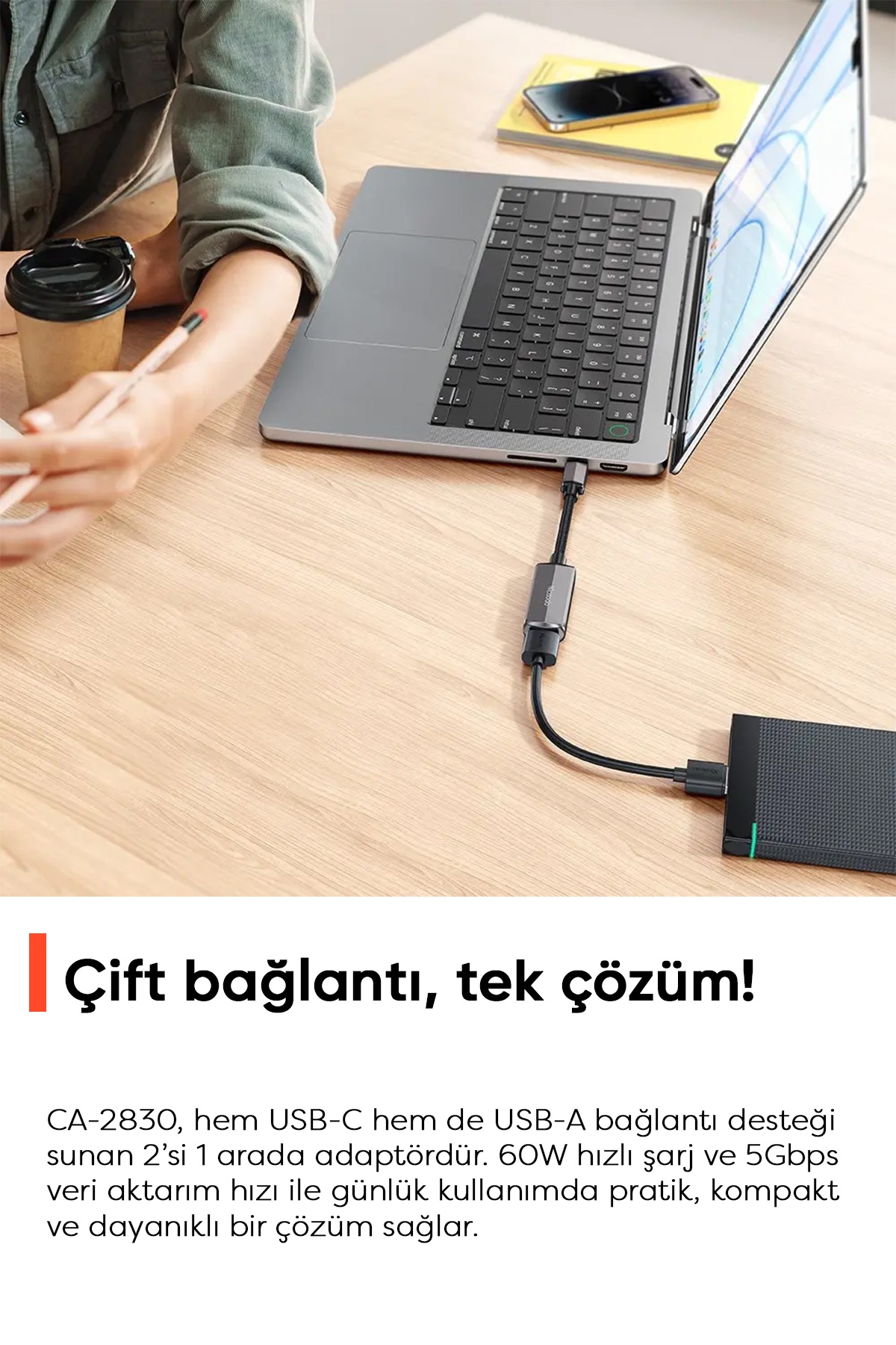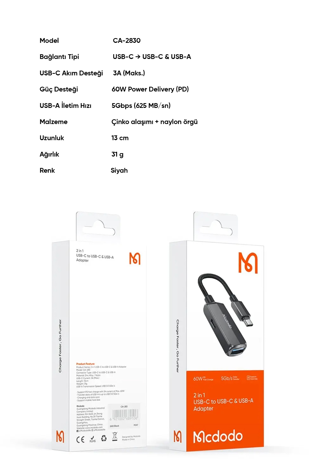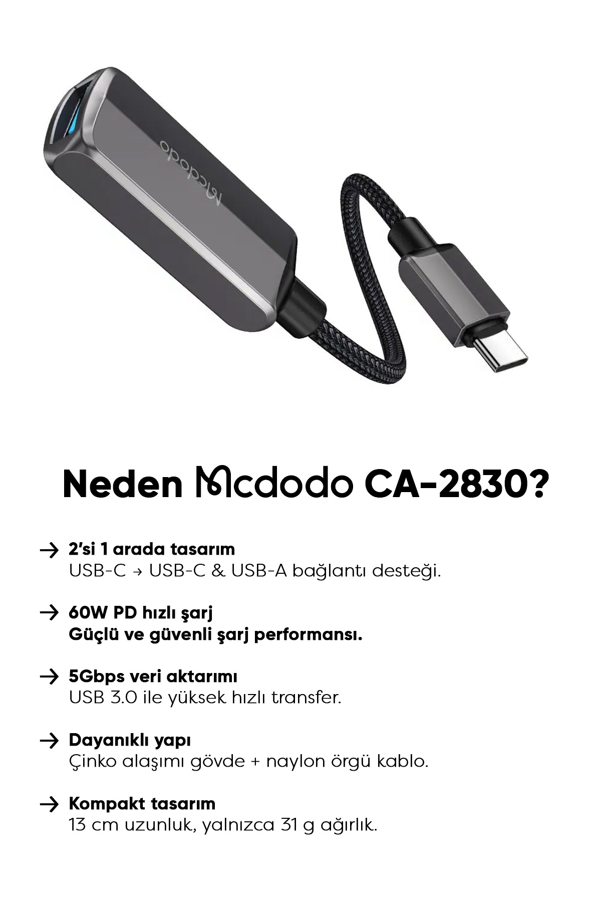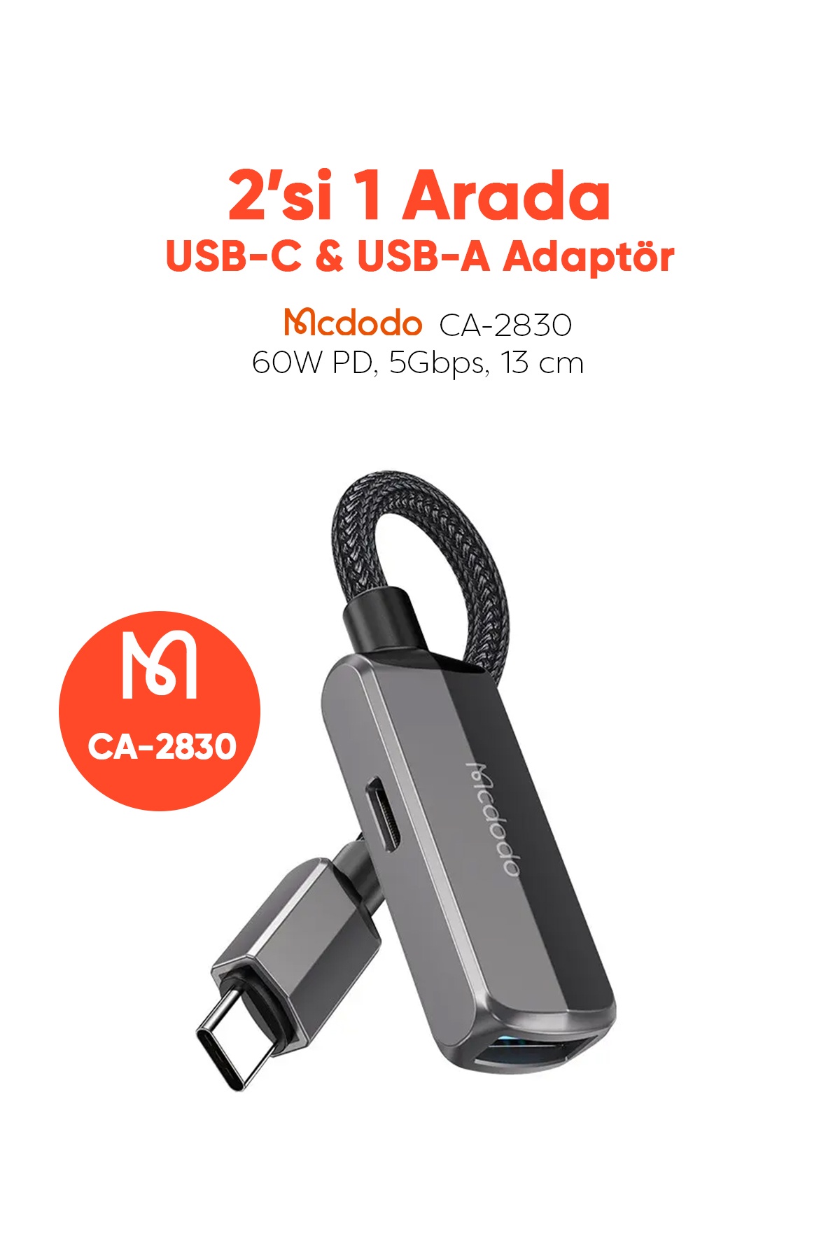 Mcdodo’nun CA-2830 modeli, hem USB-C hem de USB-A bağlantı noktalarını destekleyen benzersiz 2’si 1 arada adaptörüdür. 60W Power Delivery hızlı şarj desteği ve 5Gbps veri aktarım hızı ile mobil yaşamınızı kolaylaştırır. Kompakt ve şık yapısıyla her an yanınızda!