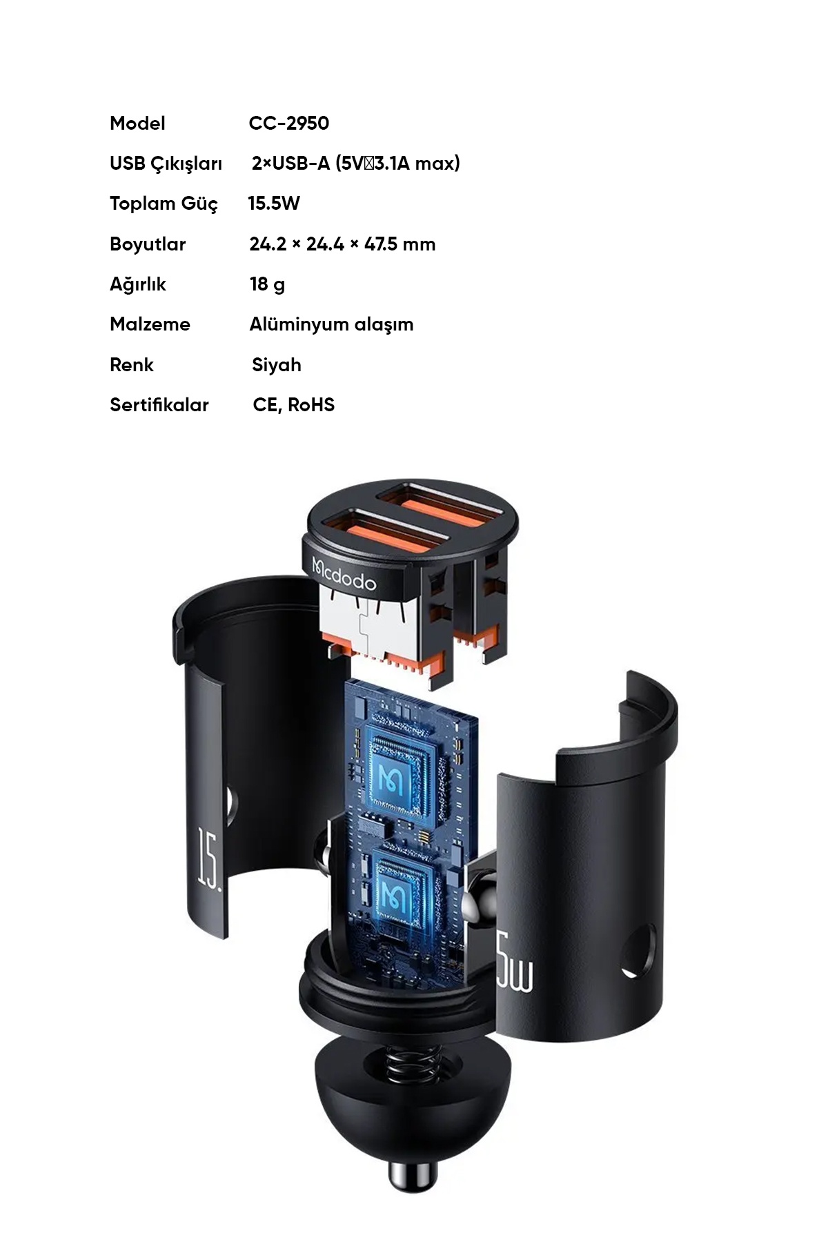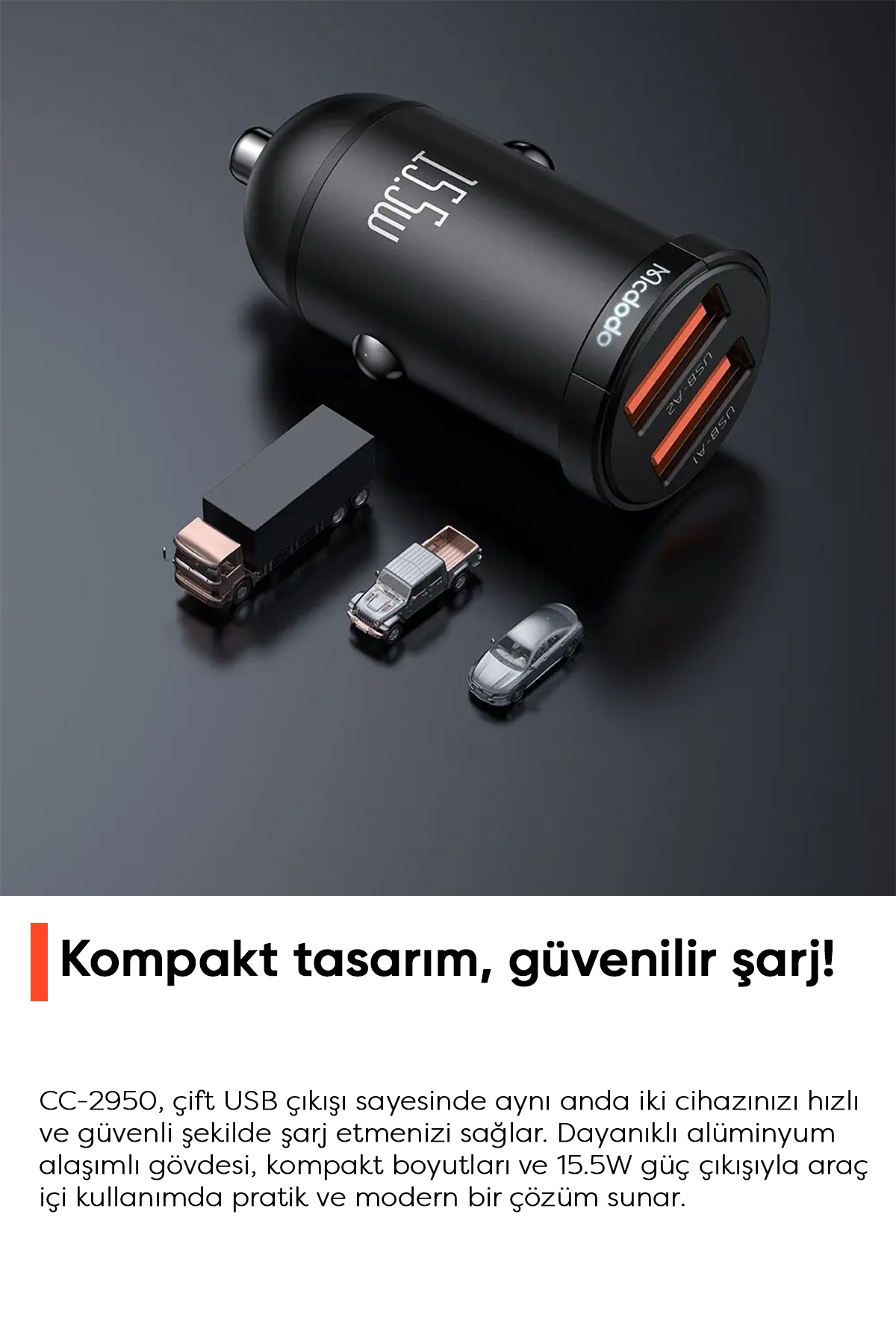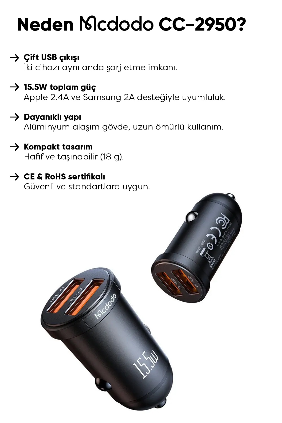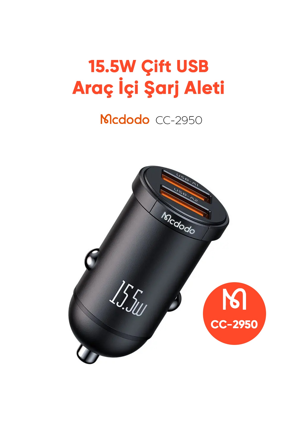 Mcdodo CC-2950 model 15.5W Çift USB Araç İçi Çakmaklık Şarj Aleti, araçlarınızda elektrik ihtiyacınızı karşılamak için tasarlanmıştır. Hızlı ve güvenilir şarj deneyimi sunan bu ürün, çift USB portu ile aynı anda iki cihazı da şarj edebilme imkanı sağlar.
